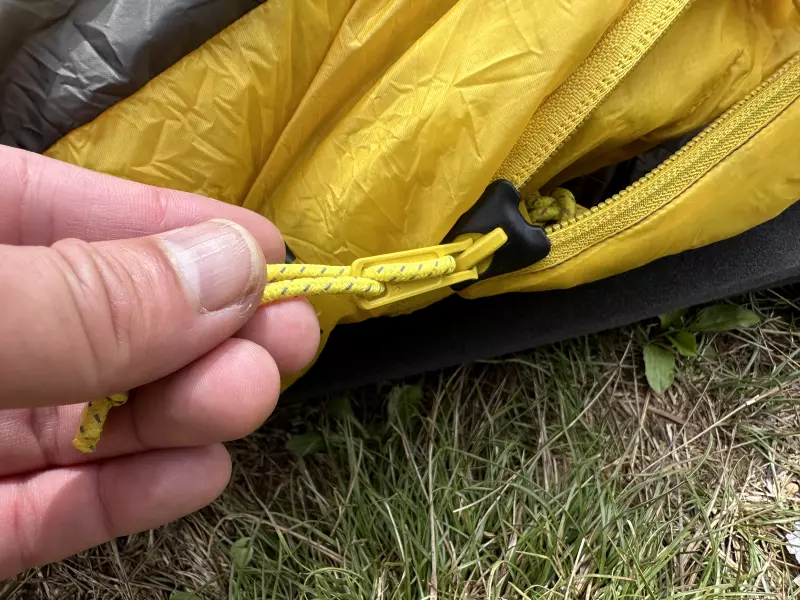 メインジッパーは長さを3/4にして軽量化を行い、内側の生地が噛み込まない構造のスライダーを採用しています。ファスナー自体もコイルがより大きく、故障しにくいのも特徴です。そしてジッパータブもフード周りの調整に使用されているバンジーコードも厚みのある素材で、就寝中に体温調整を目的のために、ジッパーを開け閉めしたり、フードのフィット感を調整したりするのに、目を閉じたままでも容易に行えるように施されています。