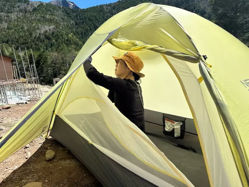 インナーテントのドアには風の侵入を防ぐブリーザブルナイロンを採用し、下部はジッパーによる2重構造で、メッシュにすることで換気を促すことができるなど、季節があり気温が変わりやすい日本の山岳シーンに使いやすくデザインされた登山用テントです。