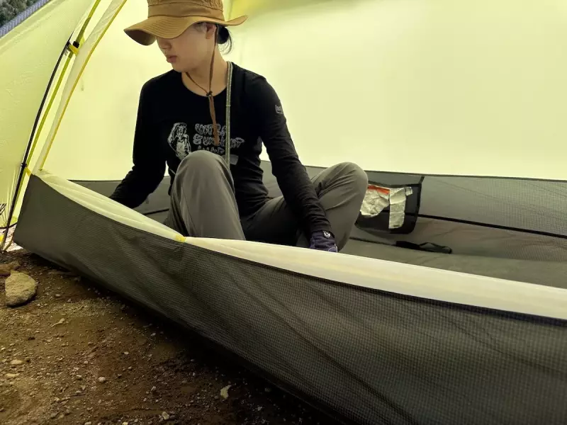 インナーテントのドアには風の侵入を防ぐ15Dのブリーザブルナイロンを採用し、下部はジッパーによる2重構造で、メッシュにすることで換気を促すことができます。それ以外の本体素材はナイロンです。軽量テントの多くがメッシュ素材を多用しているのに対して、風の侵入を防いだ素材を本体の素材に採用しているので、晩秋〜初冬、初春などの寒い季節に登山をする時にも安心して使用することができるテントです。