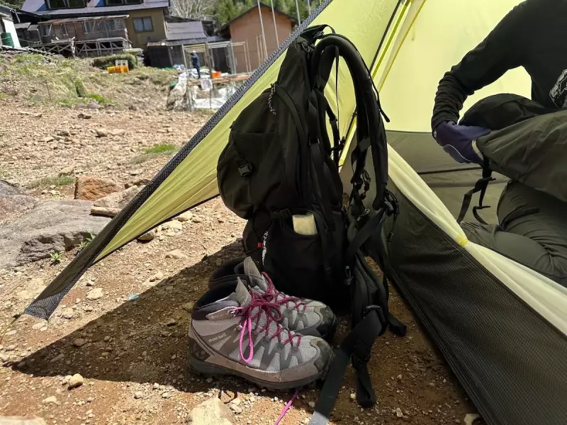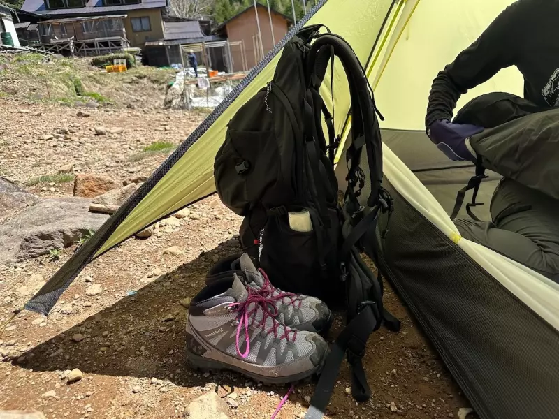 テントの出入り口は長辺に設けられており、前室面積が大きいので、例えば朝方や雨の日に前室を使って食事を準備するとき、ザックや登山靴が前室にあっても邪魔にならない良さがあります。
