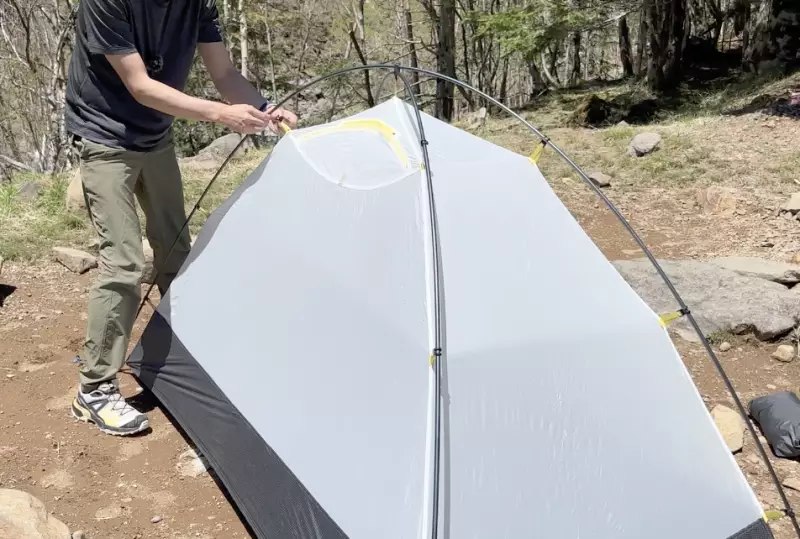 軽量なテントの多くが吊り下げ式を採用しています。スリーブ式のテントと比較した時の吊り下げ式のメリットは、スリーブ部分の素材を省くことができるため軽量化できること、また先に本体を地面に固定した後にポールを吊り下げるように設営することができるので、風に飛ばされにくい点が挙げられます。