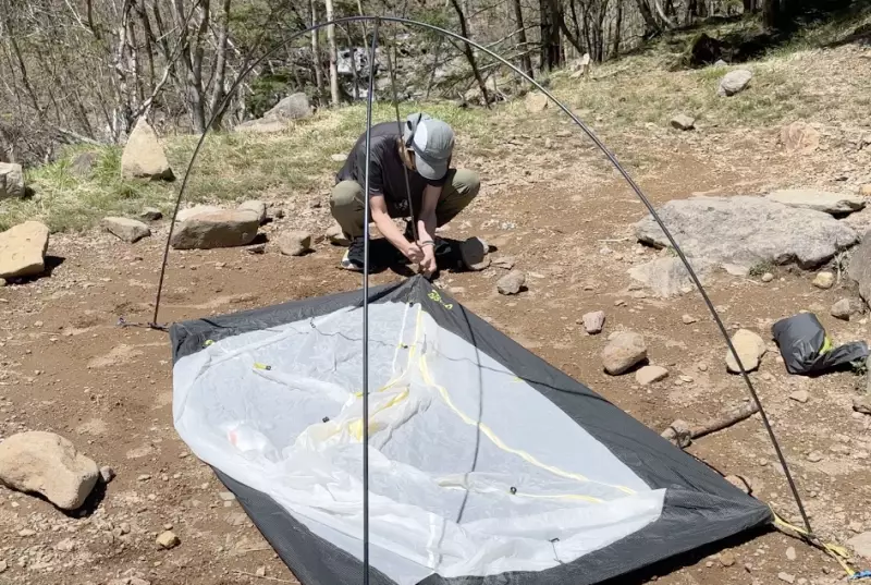タニ オズモ1Pを設営する方法は、まず本体の四隅を地面に固定します。その後四隅にポールの先端をセットしたら吊り下げていきます。吊り下げが完了したらその上からフライシートをかけます。