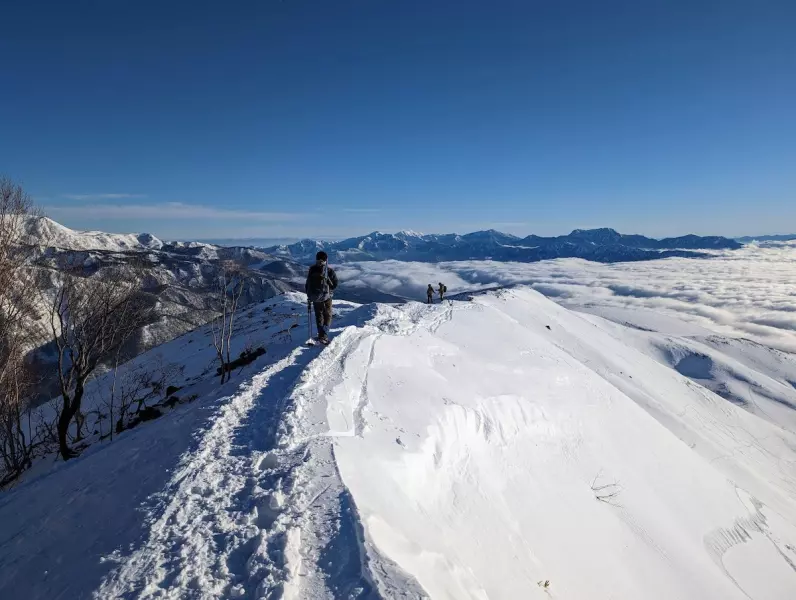 基本的に危険箇所は少ない登山道でしたが、山頂付近は急斜面や道幅が狭いところが出現します。すれ違いが難しいので譲り合って通過。アイゼンとピッケルを刺して足場をしっかりと確認しながら進んでいきます。