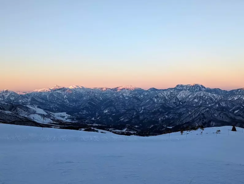 リフトの最終時間を気にすることなく16時ごろ山荘に戻ってきました。ご飯までの時間はのんびりと山が暗くなる様子を眺めます。山のイラストレータ鈴木みきさんも八方池山荘で働いていたそうで、著書ではこの静かな時間が好きと仰っていました。確かに、眩しく照されていた山々がゆったりと青に染まるこの時間。山の美しさを再発見しました。