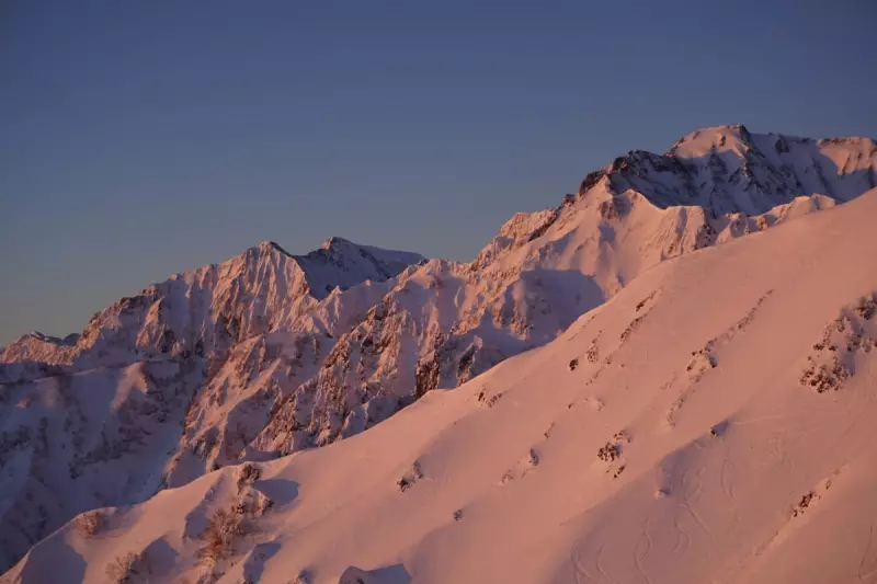 顔ケルンのところで朝日が登りました。後立山連邦の雪山モルゲンなんて、どれだけ経験を積めば見れるんだろうと思っていましたが、これも山荘に泊まったおかげです。