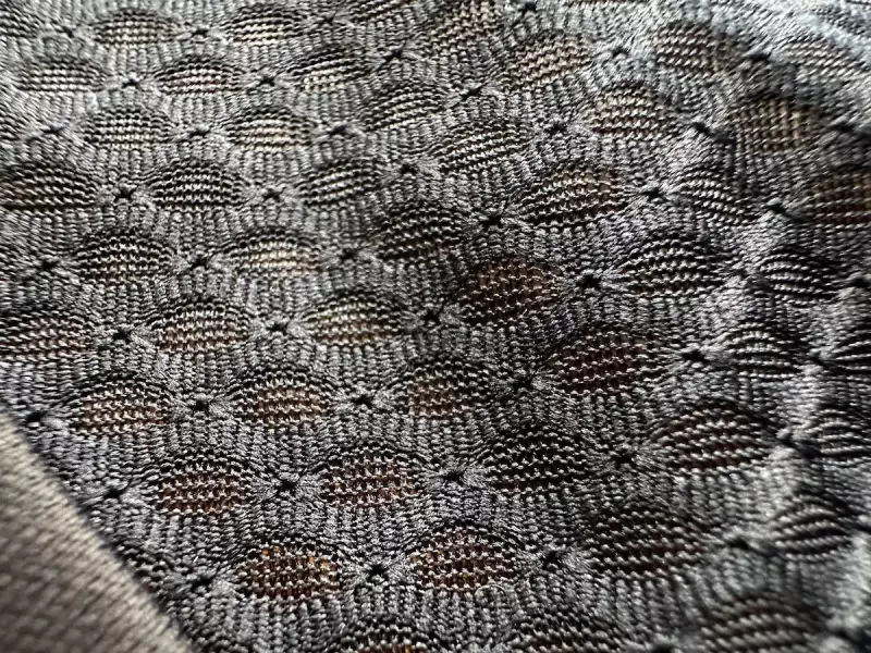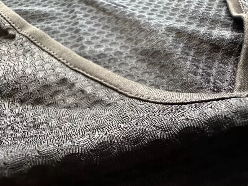 素材の構造は大きなメッシュの中に細かな網目を備えており、非常に優れた通気性とメッシュ構造による凹凸で汗をかいた時にウェアが素早く吸収し肌をドライに保ちます。