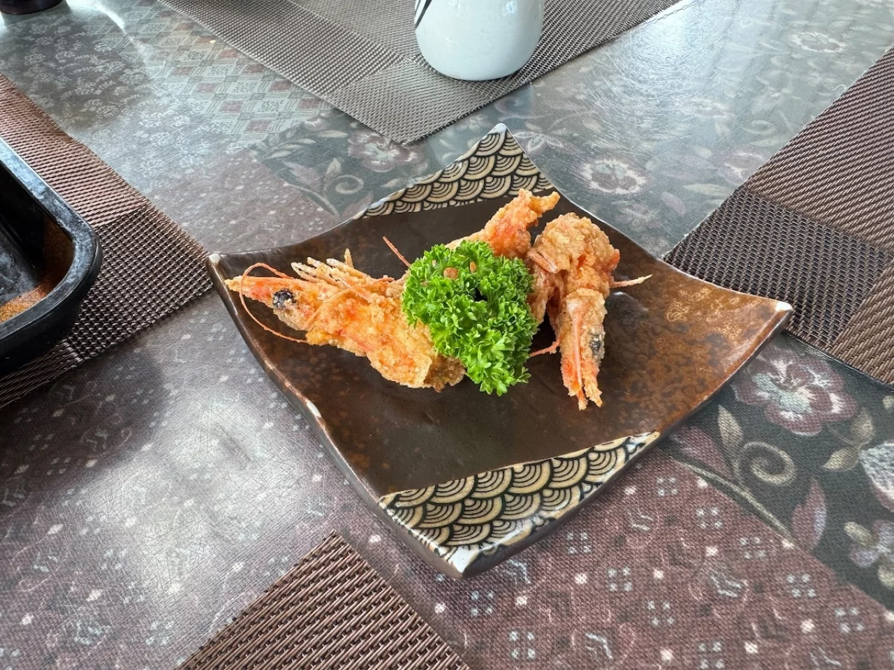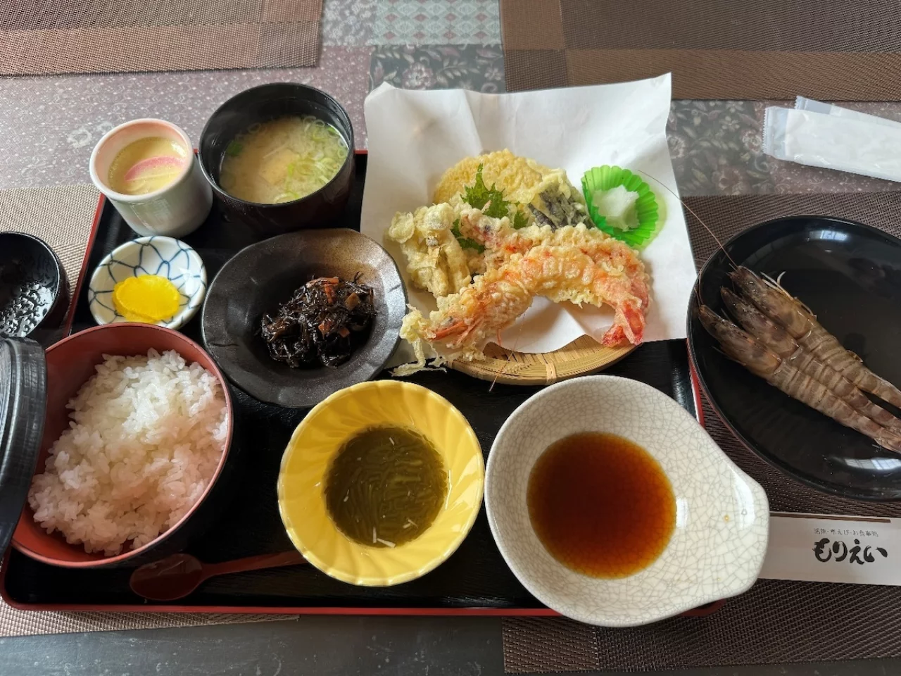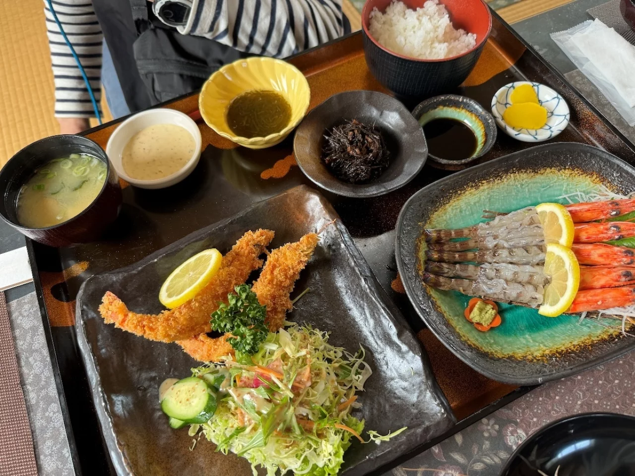 私が注文したのは次の写真、エビフライと生海老の定食です。
