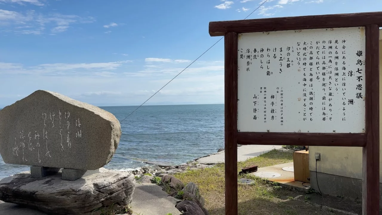 (姫島七不思議のひとつ「浮洲(うきす)」の説明 観音崎登山道前 海岸沿い)