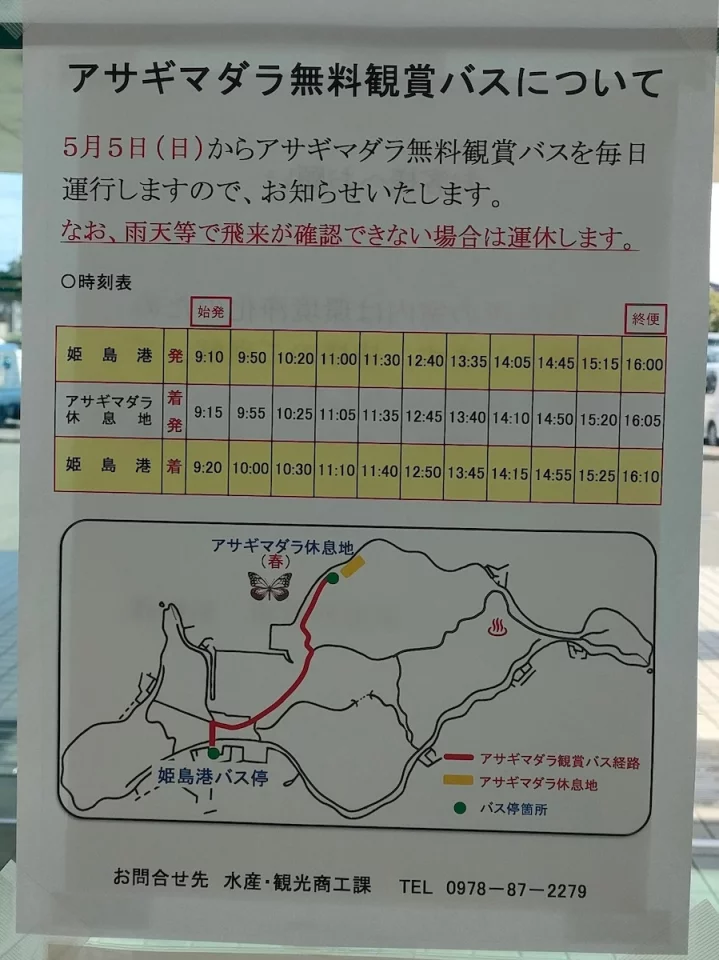 (蝶のシーズン以外も島内を巡回する無料バスが常時走っているようです)