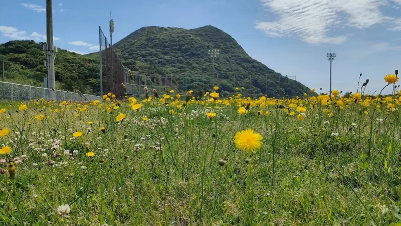 (使っていないグランドにタンポポが一面咲いている。後ろには矢筈岳)