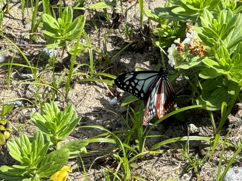 アサギマダラは、姫島のみつけ海岸のスナビキソウの蜜を求めて5月上旬から6月上旬頃、南の地から渡ってくるそうです。