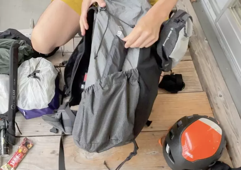 ザックのサイドに設けられた大きなポケットの上部のストレッチバンドは強いのであやまって入れたものが落下しない安心感はありますが、例えばチェーンアイゼンやサングラスケースなどの少し大ぶりなものを収納すると出す時に引っかかるので取り出しづらいというデメリットがあると思いました。ここも好みが分かれるポイントだと思います。