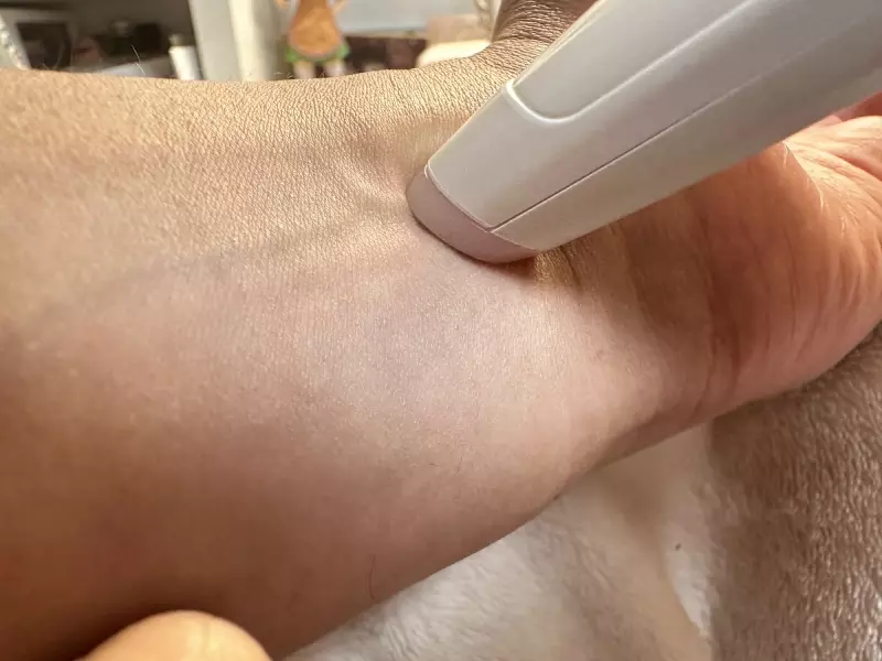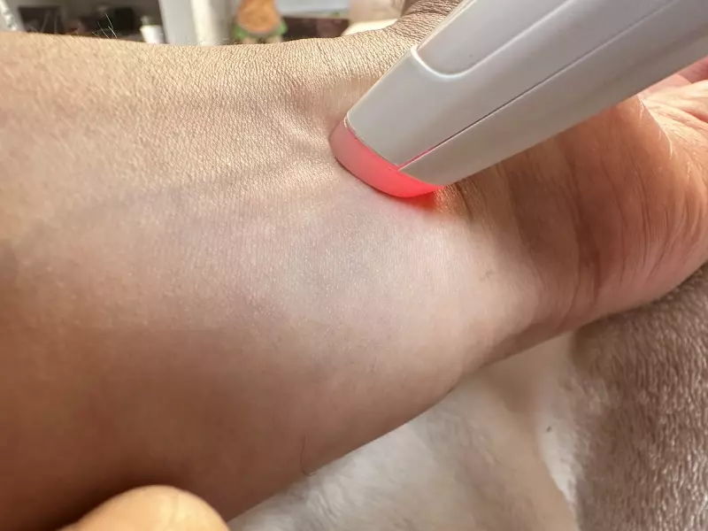 段階を決めたら、痒いと感じる患部にペンの先端を押し当てて炎のマークのボタンを押します。そうするとペンの先端からはパルス状の熱波や振動によって皮膚を加熱します。