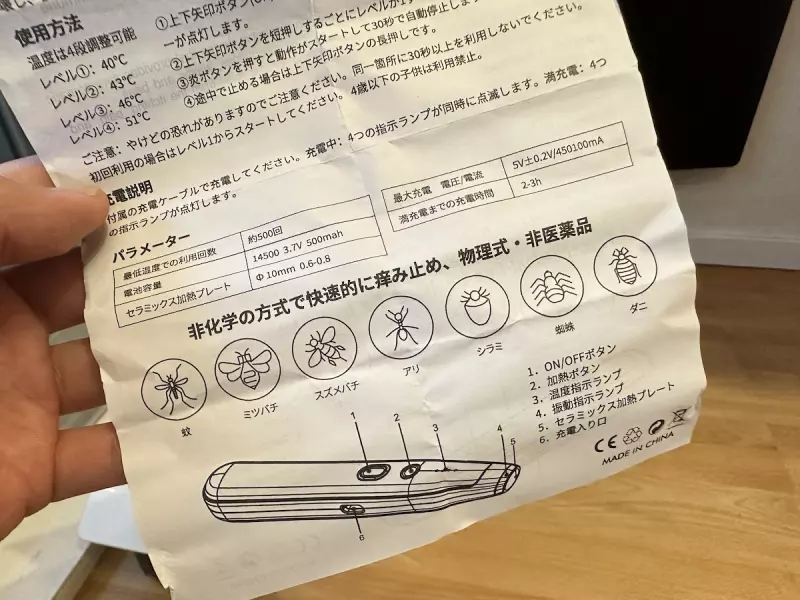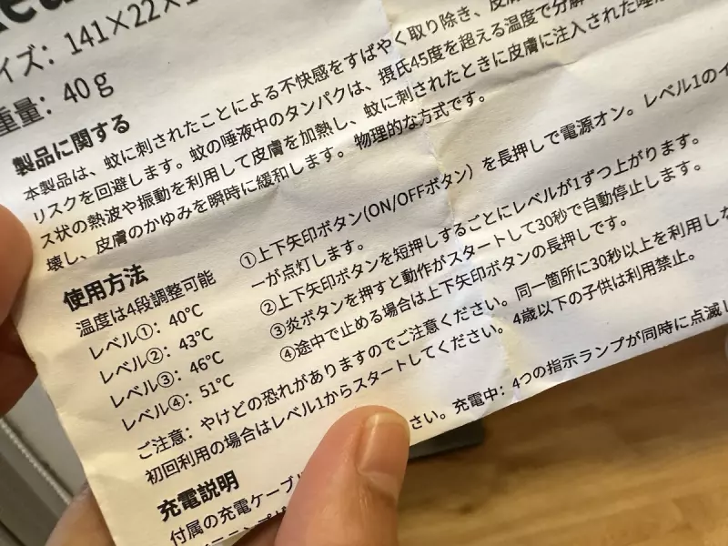実際に家の近くで蚊に刺された時に痒み止めペンを使用しました。説明書にあるようにレベル1からスタートして結果をチェックすると、僕の場合はレベル1で痒みを取り除くことはできませんでした。段階的にレベルを上げていくと、レベル3ぐらいまでは無理なく我慢することができたのですが、レベル4ともなると非常に熱く思わずペンを皮膚から離したくなるような気持ちになります。