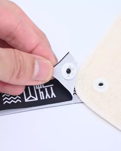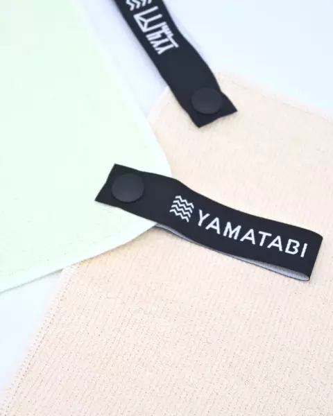 素材はコットン100%の泉州のタオル(化学繊維不使用の綿100%)です。角に取り付けられたストラップはナイロン製で、スナップボタン付きです。