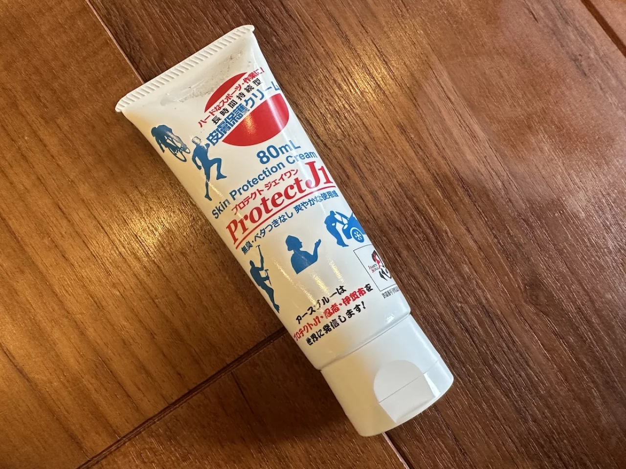 トレイルランナーの友人が使っていて、すごくいいよ!と紹介してくれてそれから使っているのがプロテクトJ1という製品です。これは皮膚保護クリームで、登山の前にマメができやすい部分に擦り込むと、保護膜成分が皮膚の角質に入って皮膚を保護してくれます。