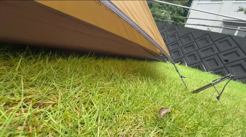 夜間の暴風雨対策にベンチレーションをテントの外に固定する