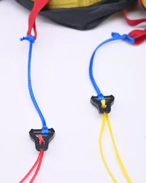 ガイラインが緩んでいるとテントの強度や安定性が保てません。ガイラインに長さを調節する自在(スライダー)が付いている場合、張り綱がピンと張るくらいまで自在を動かして調節します。