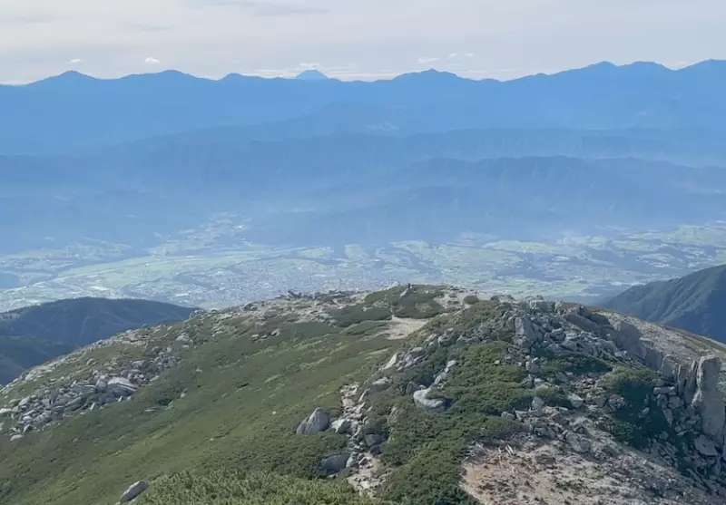 乗越浄土(のっこしじょうど)を背にして伊那前岳を通り過ぎそのまま北御所林道を歩いて行くことで下山することができます。この下山道の稜線を眺めて目を上げると長野県駒ヶ根市を一望できます。街と山との距離が短く、密集している建物や畑など、町の形を楽しむことができるのも伊那前岳ならではです。