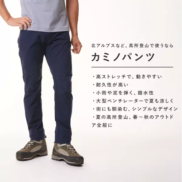カミノパンツは着用した時のシルエットが非常に美しく、シンプルなデザインが特徴です。それでいて登山シーンにおいても履き心地に優れた特徴を備えています。