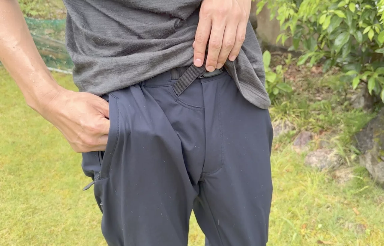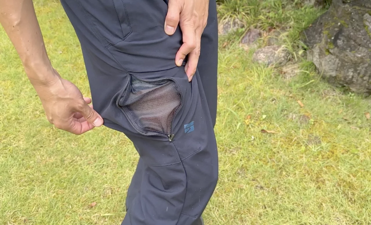容易な換気機能も特徴で、両腿に目立ちにくい大型ベンチレーターを配置しています。ズボンのこの場所のベンチレーションはかなり涼しく、汗蒸れが起きづらく、樹林帯を歩いているときは、このようなベンチレーションがないパンツと比べて非常に快適です。