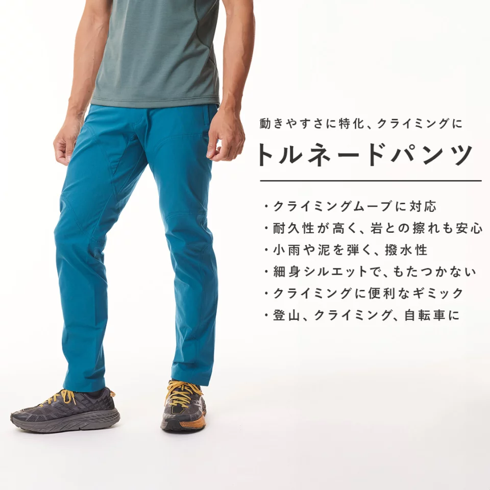 高密度なストレッチナイロン生地を、曲線のラインで脚を包みこむ革新的なオリジナルパターン「トルネードレッグ」で縫い上げたことによる高い運動性と、ハーネス使用時に干渉しにくいフロントデザインなどによるストレスフリーな穿き心地を実現したテクニカルパンツ。クライミング、登山、沢登り、サイクルなどにも対応します。