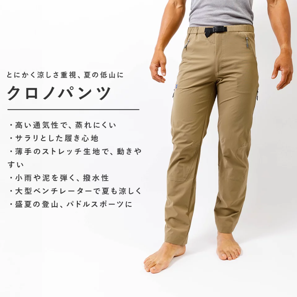 クロノパンツは4種類のトレッキングパンツの中では最も軽量で平均重量で265gです。非常に薄手の生地で作られた涼しさ重視のトレッキングパンツです。シルエットはレギュラーと呼ばれる少しゆったりとしたタイプで夏山登山におすすめのモデルです。