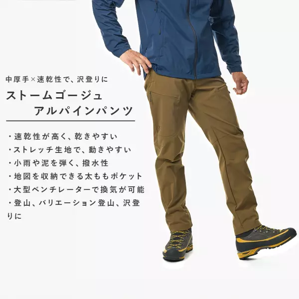 ストームゴージュアルパインパンツは4種類のトレッキングパンツの中では最も重い平均重量で410gです。生地厚は中厚手で優れた防風性と耐摩耗性を備えたオールシーズン着用できるトレッキングパンツです。原糸の段階からきめ細かなクリンプ(糸自体をコイルのように伸縮させる)を持たせる特殊な製法による、ヘタりにくいメカニカルストレッチを採用しているので、ハードな山岳クライミングから春スキーなど様々なシーンで活用できるモデルです。