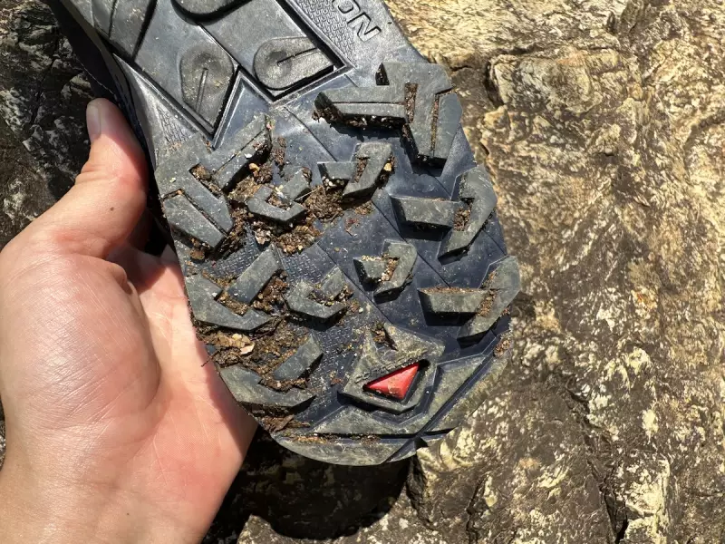 これによってトレイルランニングシューズの柔らかさはなく、アウトソールに程よい剛性が備わっており、一般的なハイキングシューズと比較しても安定した歩行が可能です。