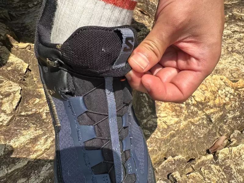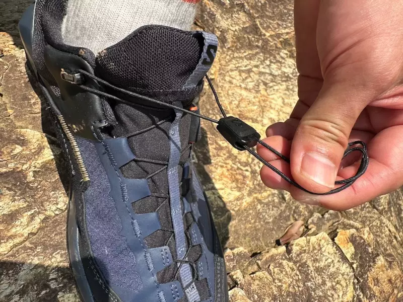 シューレースにはクイックレースが採用され、紐を引っ張って素早くフィット感を高めたり、足を休ませたい時にも素早く開放させることができます。また余った紐はシュータン部分に収納することができるので登山道で紐が引っかかったり、意図せず紐がほどけたりするストレスから解放されます。