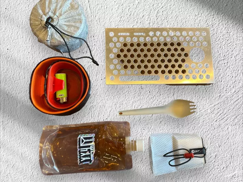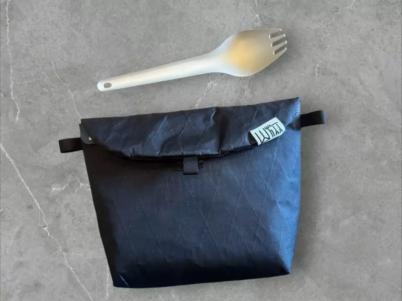 カトラリーはアルファ米とスープという献立なのでスプーンが便利です。お酒を飲む時はソーセージなども持っていくので、先割れスプーンがとても使い心地に優れています。僕が使っているUL先割れスプーンは、スクウェル死させるし非常に使い心地に優れたアイテムで、しかも重量わずか7gという軽さが特徴です。