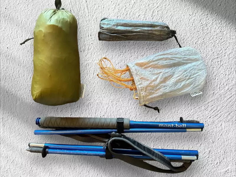 ツエルトはテントポールはなく、代わりにトレッキングポールを使用します。ポールは110〜120cmの長さのものがちょうどよく、僕はモンベルのU.L.フォールディングポール120を使用しています。