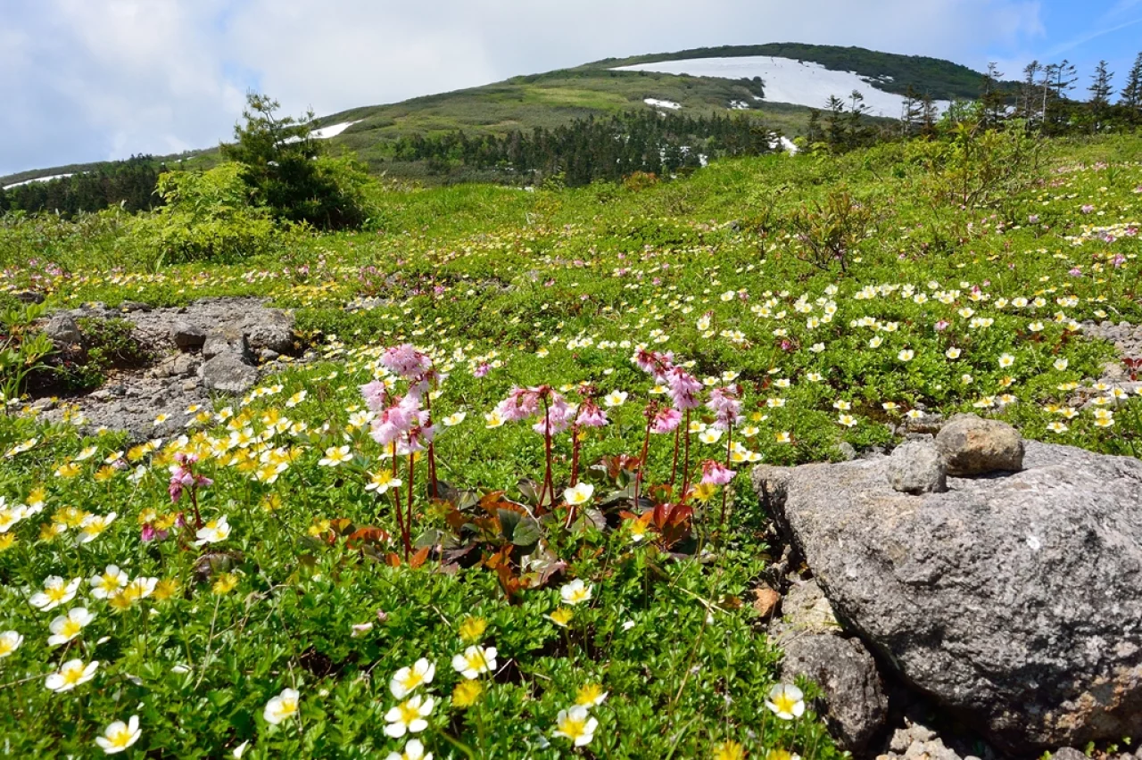 森吉山は、秋田県の中央東部に位置する標高1,454mの火山活動によって形成された美しい山です。花の百名山として有名で、初夏から晩夏にかけ野花が咲き乱れる高山植物の宝庫であり、四季折々の風景や豊かな自然環境とも相まって多くの登山客を魅了しています。