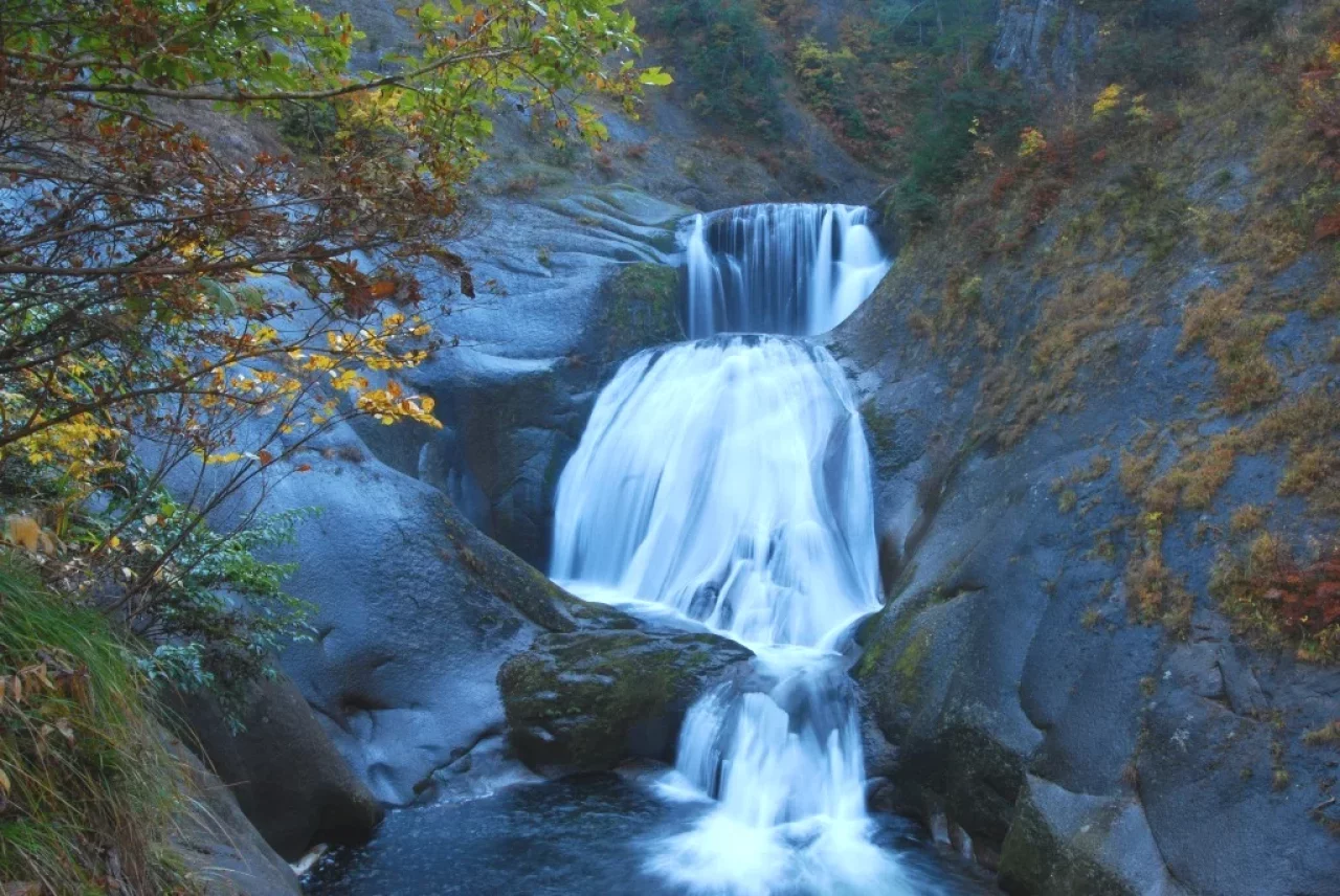 柱状節理を下る落差38mの一ノ滝(いちのたき)、階段状の美しい滝である落差20mの二ノ滝(にのたき)、山肌を一気に清流が滑り落ちる落差108mの豪快な幸兵衛滝(こうべえだき)を楽しむことができます。