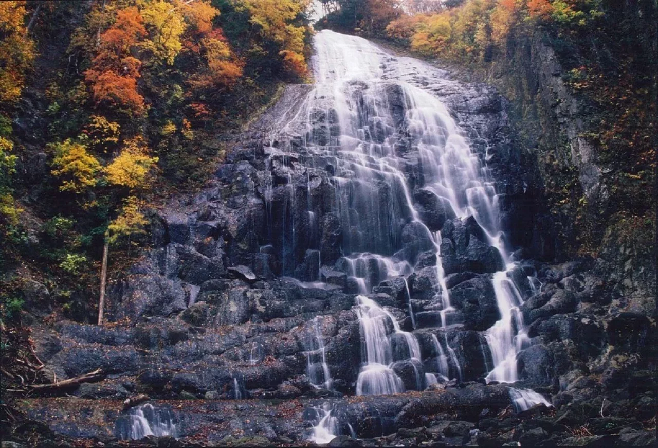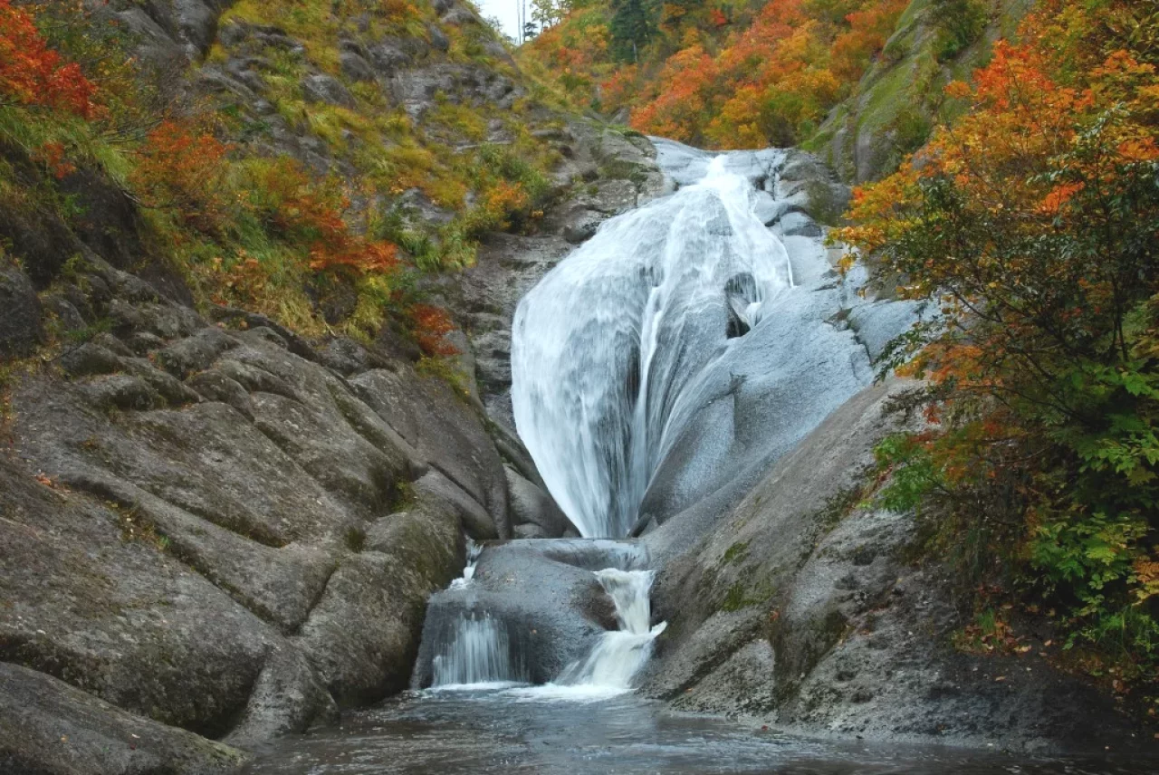 なだらかなU字渓谷に大小のおう穴と滝が点在し、清流のきらめきと稜線の鮮やかな彩りの中を散策するコースは「天国の散歩道」と呼ばれています。