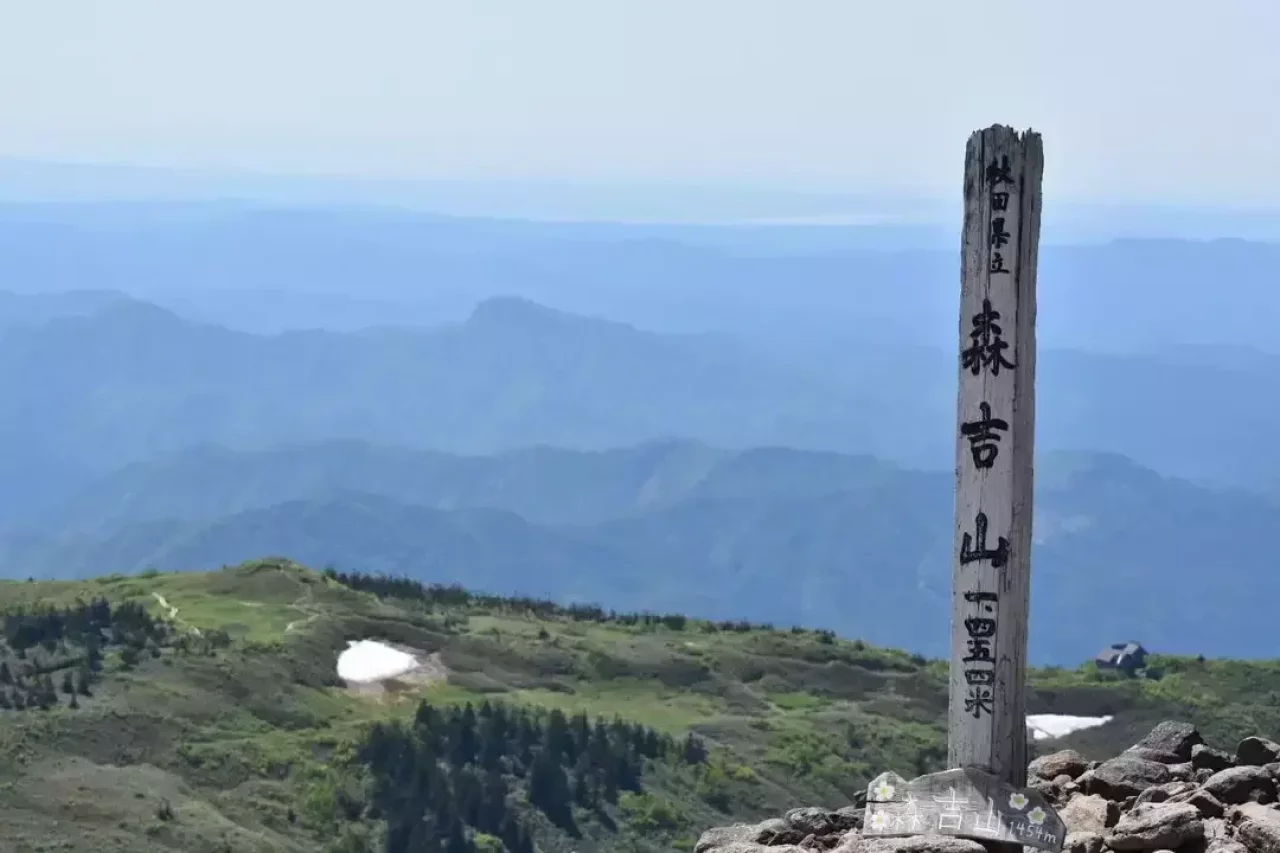 森吉山(もりよしざん)は、秋田県北秋田市に位置する標高1,454mの山、日本二百名山です。向岳(むかいだけ)や秋田山(あきたやま)とも呼ばれ、江戸時代の北前船はこの森吉山を見て方角を知ったと言います。