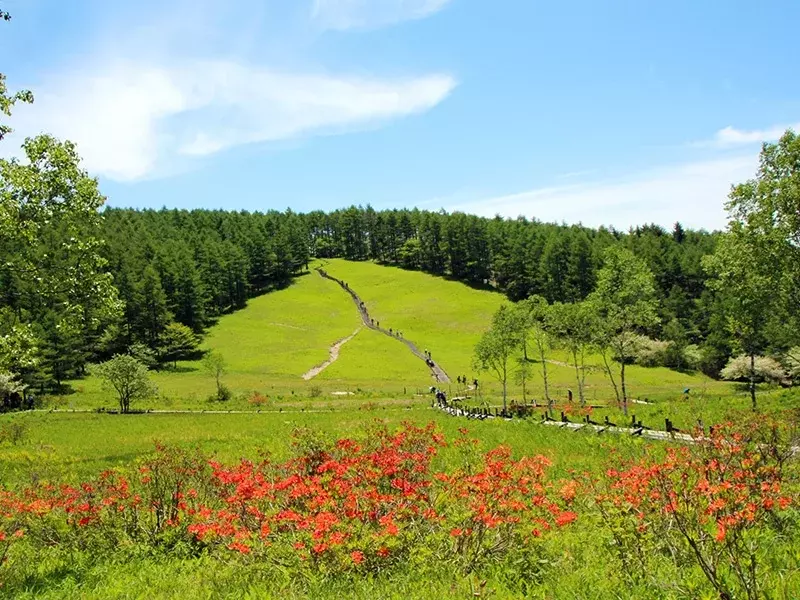 この草原と、起点となる牧場に惹かれて根子岳と縦走するコースが人気ですが、コースタイムが長めで累積標高も1,000m前後あるため、しっかりと歩きたい方向きです。もう少しラクをしたい方は、群馬県側のパルコール嬬恋リゾートのゴンドラを利用して、一気に標高2,050mまで上げましょう。山頂駅から約1時間半で登頂できます。