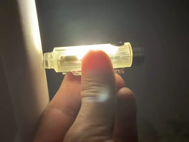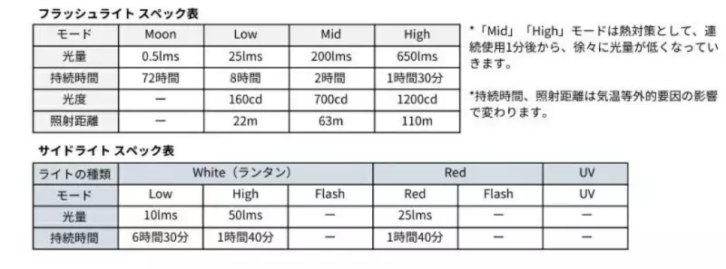 これ以外にサイドライトがついていて、本体の側面に明かりがつきます。こちらも4つのモードがあり、Lowモードが10ルーメン、Highモードが50ルーメンです。夜間における視力維持に最適な赤色モードは点灯と点滅モードで切り替えが可能です。