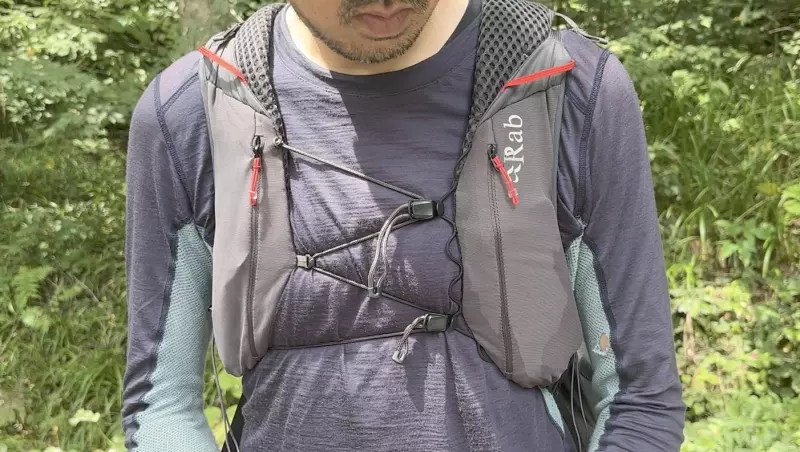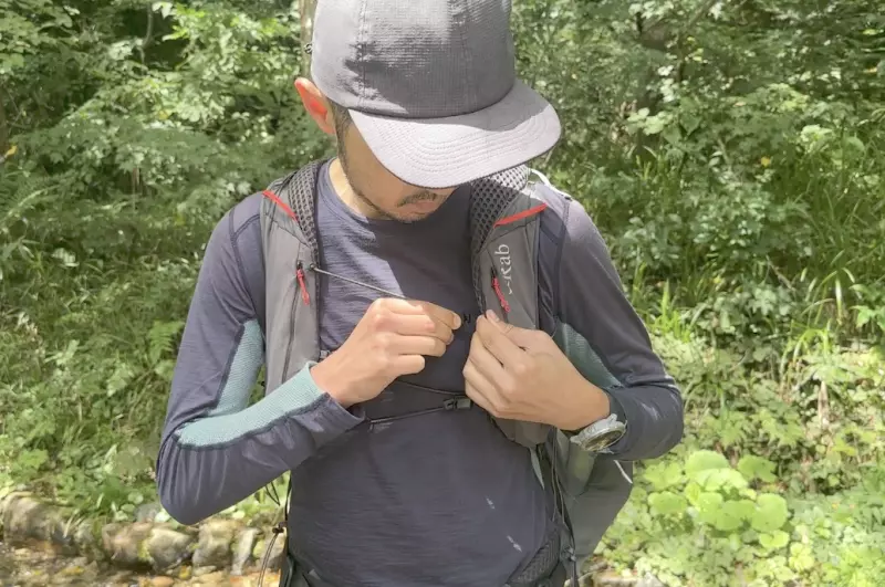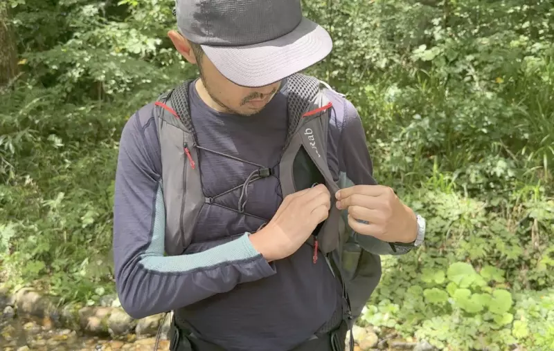 ショルダーに取り付けられたポケットにはスマホ、行動食など収納しておきます。