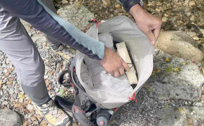 サイドポケットはザックを背負ったままでも手で掴みやすいデザインで、行動食用に準備しておいたスタンドコジーに入れたアルファ米や水筒を収納しておけます。