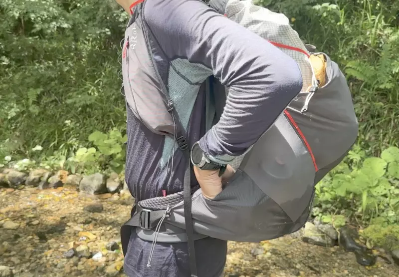 ウエストベルトも非常にユニークな構造で、ザック本体側のサイドポケットの素材とウエストベルトのストラップが連結しています。これによってウエストベルトをベルトを閉めるとザックが体に近づき、骨盤の側面から包み込むようにフィットします。
