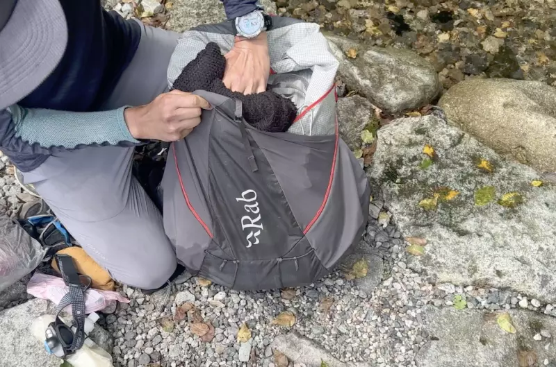 フロントポケットにはレインウェア、ウインドブレーカー、ミドルレイヤーなどをパッカブルせずそのまま突っ込むように収納しておけます。