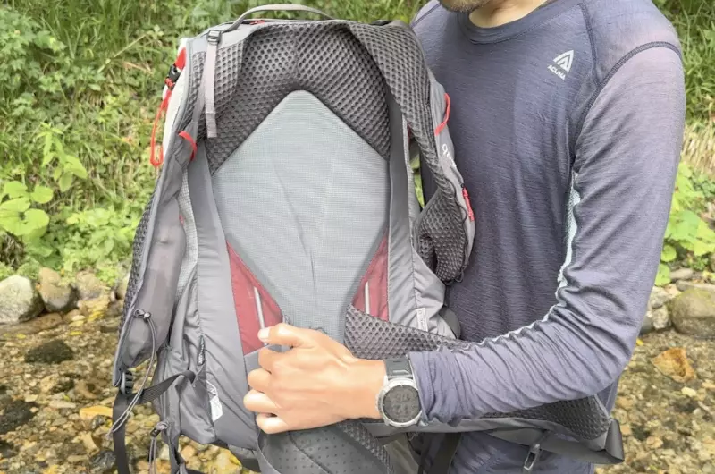 このフレームと、肩と腰のフィット構造によって、体とザックが一体化せずにザックだけが揺れているといったようなことがほとんどなく、疲れづらい登山が可能なんです
