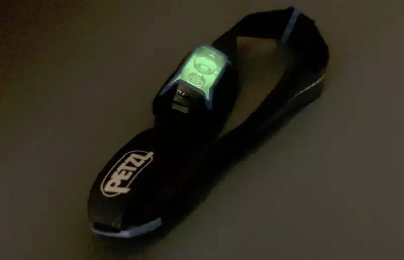 ヘッドライト本体の点灯部分には蓄光が備わっており暗闇の中で目立ちます。だから暗闇でヘッドライトを見つけやすく、特に夜にテント場を出発するようなシーンにおいては蓄光があるかないかで、見つけやすさが格段に異なります。