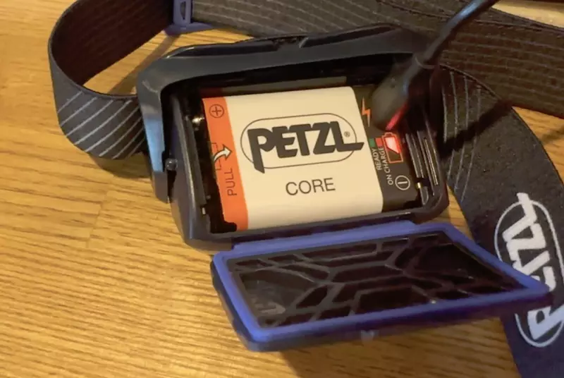 ヘッドライトを上の方向に上げると、ヘッドライト本体が回転して電池ボックスの蓋が現れます。この蓋を開けると中に「コア」が入っています。蓋は非常に硬く最初開ける時は壊れてしまうんではないかと不安になると思いますが大丈夫です。このリチャージャブルバッテリー「コア」にマイクロUSBの差し口があるので、この場所にケーブルを挿せば充電できます。