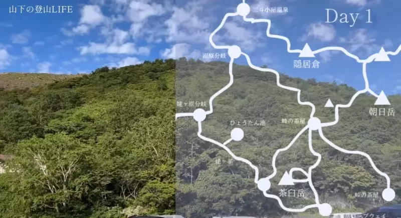 ルートは峠の茶屋駐車場→峰の茶屋→朝日岳山頂→隠居倉→三斗小屋温泉大黒屋