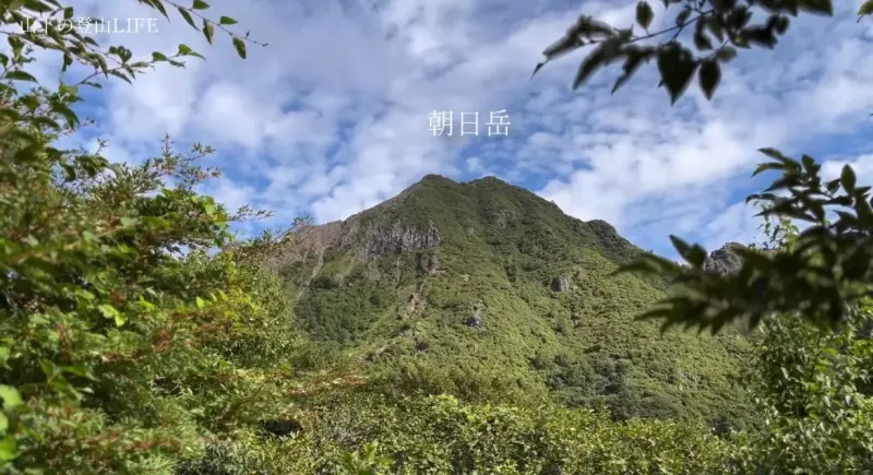 三斗小屋方面に進み、40分程で樹林帯を抜けると、朝日岳が出迎えてくれます。