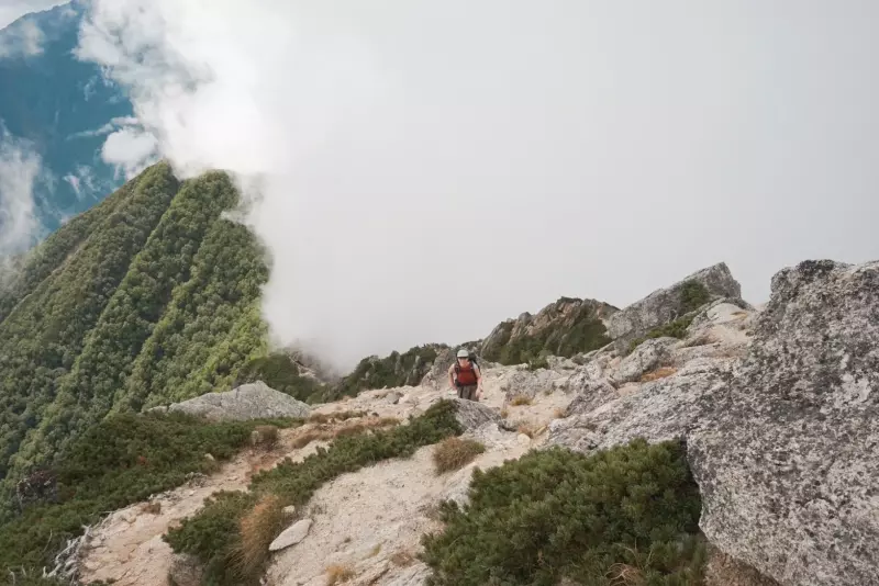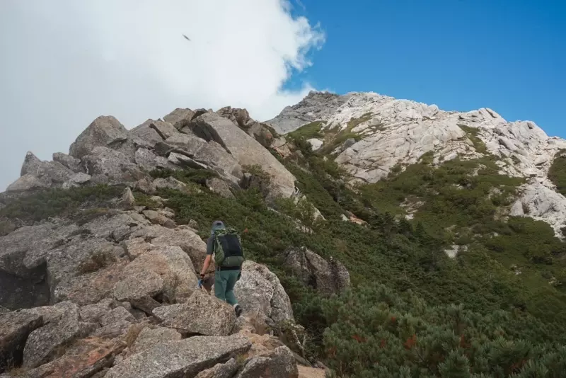 ぬるりと登頂したので、一応やなさんも呼んで登頂したぜ的な動画を撮ってさっさと次の山頂?に向かった。やなさんはやなさんで多分登頂してから少し時間が経っているので感情が落ち着いているし、私らは私らで東駒ヶ岳に騙されたりのぬるり登頂だったからよくわからない感情になっていて、あとちょうど曇ってきたのもあって、そんなに景色を楽しむことなくささっと降りた。