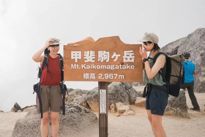 一緒に写真を撮るために、残りの登りをチャッと登ったら、看板に「甲斐駒ヶ岳」とちゃんと書いてあって、ぬるりと登頂したことになった。