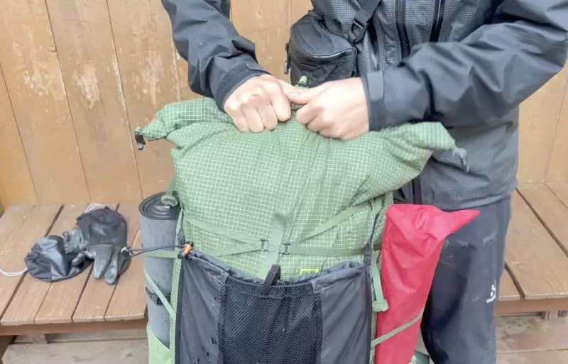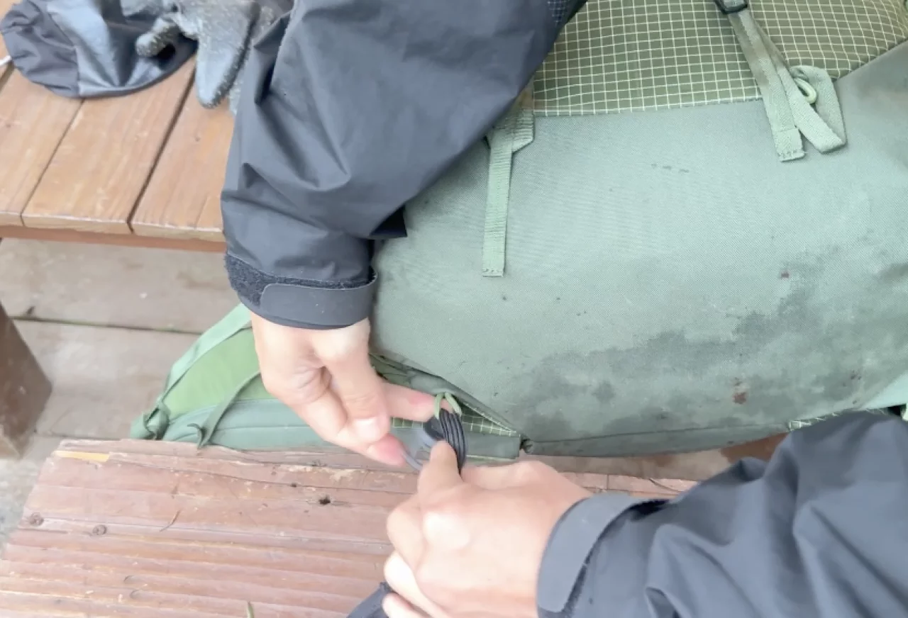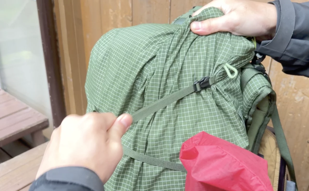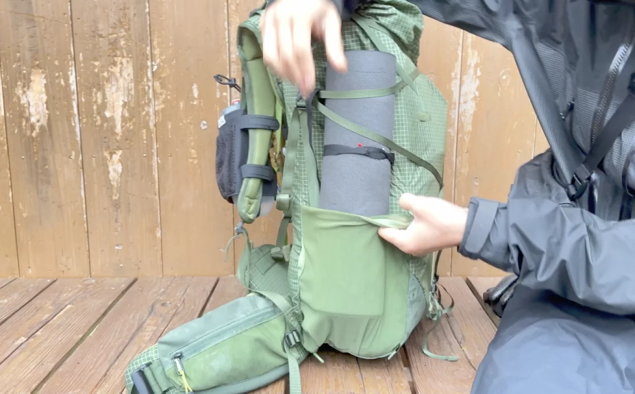 メインコンパートメントはロールトップ式を用いています。これによって雨が降っても中のものを濡らしづらく、さらに容量の調整が可能です。例えば登山開始時点ではザックの中に食料が多く入っていたけれども、最終日は少なくなっているなんていうことは想像が容易です。このような状況においてもロールトップなので上から圧縮をかけて、中の装備を固定させることができます。